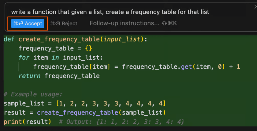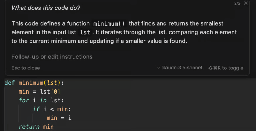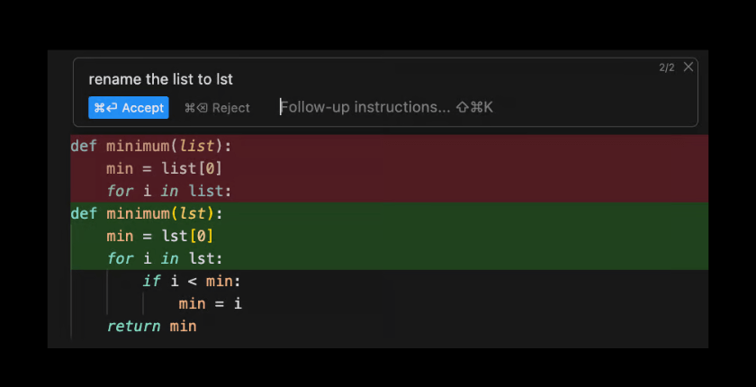 Ví dụ: nếu bạn bắt đầu viết một hàm có tên maximum(), Cursor AI sẽ nhận ra ý định của bạn và đề xuất cách triển khai hàm. Chỉ cần nhấn Tab, mã được đề xuất sẽ tự động được thêm vào.