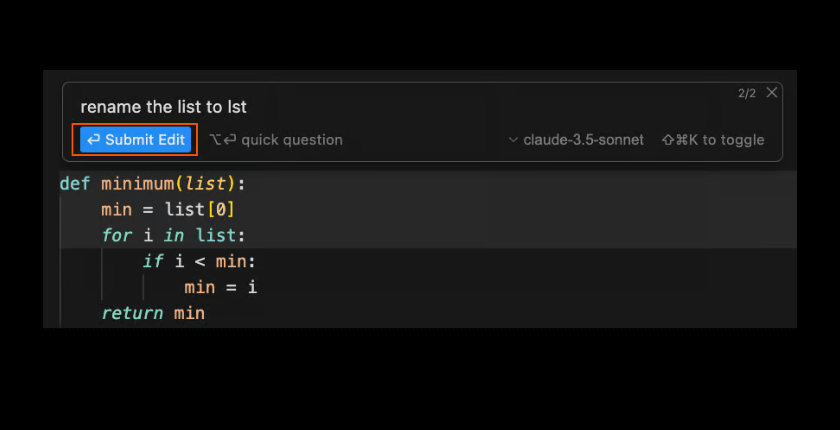 Để tương tác với mã hiện có, bạn chỉ cần chọn đoạn mã cần chỉnh sửa trước, sau đó nhấn tổ hợp phím Cmd + K. Việc này giúp bạn thực hiện các thay đổi như tái cấu trúc mã hoặc đặt câu hỏi về đoạn mã đó. Sau khi nhập lời nhắc, chỉ cần nhấn Submit Edit để nhận các sửa đổi được đề xuất.
