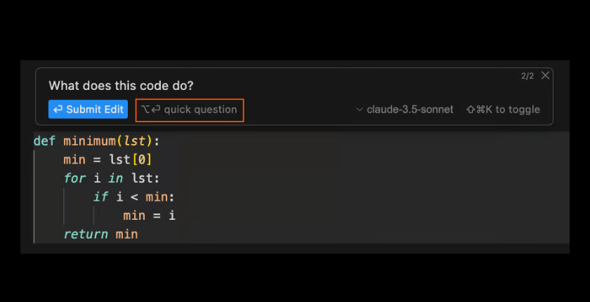Tương tự như vậy, bạn có thể đặt câu hỏi về một đoạn mã bằng cách chọn đoạn mã đó và nhấn tổ hợp phím Cmd + K. Khi có câu hỏi, chỉ cần nhấn vào nút Câu hỏi nhanh để gửi lời nhắc.
