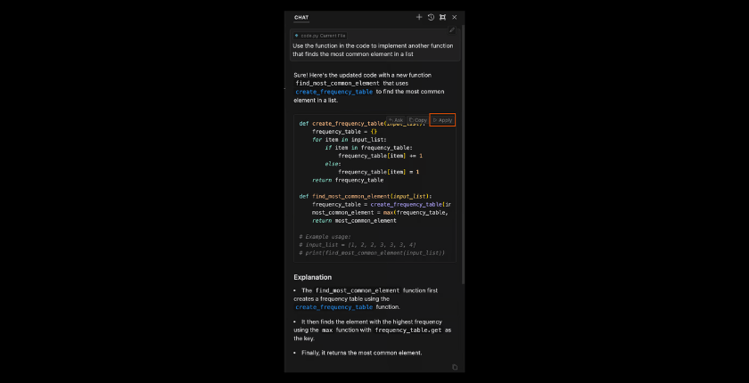Giống như khi tạo mã bằng tính năng trò chuyện nội tuyến, bạn cũng có thể tạo mã thông qua tính năng trò chuyện. Mã được tạo trong cuộc trò chuyện có thể được tích hợp vào dự án của bạn bằng cách nhấn nút Áp dụng ở góc trên cùng bên phải của cửa sổ mã.