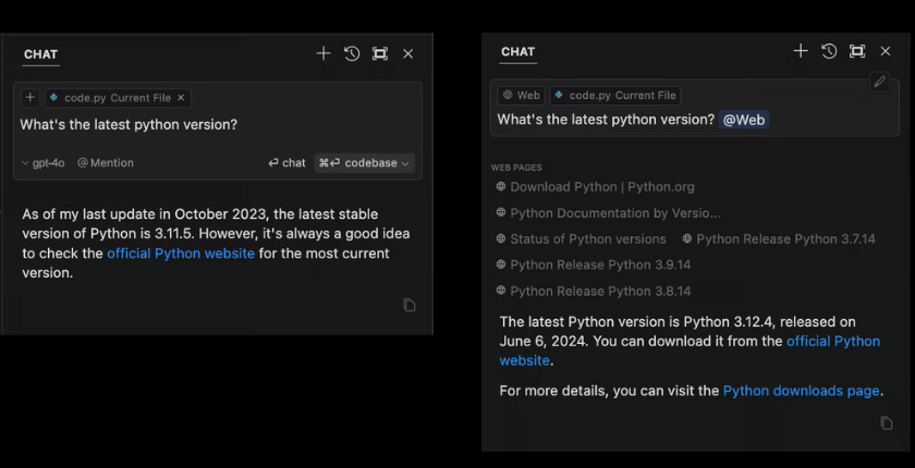 Ví dụ, bạn có thể sử dụng @Web để yêu cầu AI tìm kiếm câu trả lời trên internet.