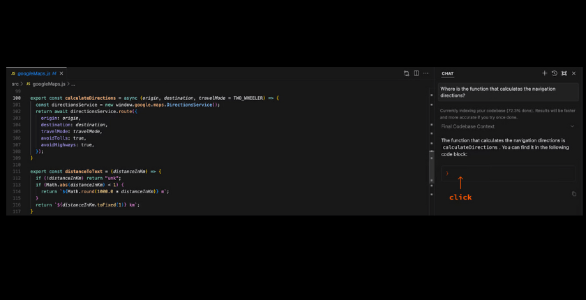 Một trong những tính năng hữu ích nhất khi làm việc với các dự án lớn là khả năng nhanh chóng tìm kiếm một đoạn mã trong toàn bộ cơ sở mã. Ví dụ, bạn cần tìm một hàm trong dự án tính toán hướng điều hướng của một ứng dụng. Với Cursor, bạn chỉ cần mô tả chức năng của hàm đó và dễ dàng xác định vị trí nó.