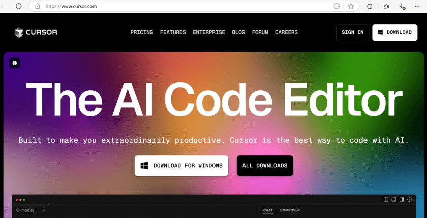 Bước 1: Truy cập vào trang web chính thức của Cursor AI tại địa chỉ https://www.cursor.com, sau đó nhấn vào nút “Download” để tải xuống phiên bản phần mềm phù hợp với hệ điều hành bạn đang sử dụng (Windows, macOS hoặc Linux).