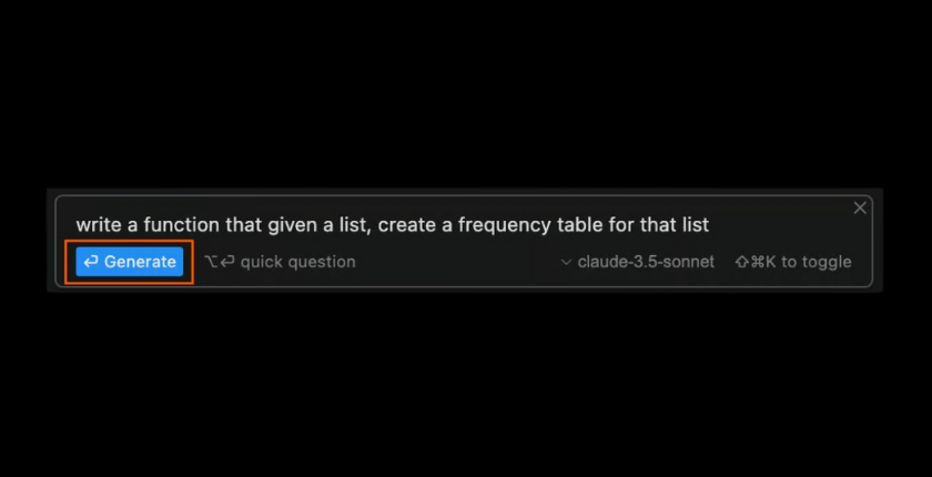 Để tạo mã nội tuyến trong Cursor, bạn hãy nhấn tổ hợp phím Cmd + K (hoặc Ctrl + K nếu dùng Windows/Linux). Khi đó, một cửa sổ nhỏ sẽ hiện ra – bạn chỉ cần nhập lời nhắc (prompt) mô tả đoạn mã mình muốn tạo vào đó, và Cursor sẽ tự động sinh mã phù hợp.