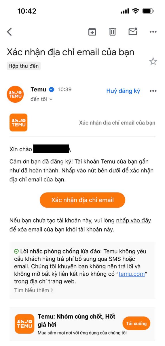 Temu sẽ gửi một mã xác nhận qua email hoặc số điện thoại mà bạn đã cung cấp. Nhập mã này để xác thực tài khoản.